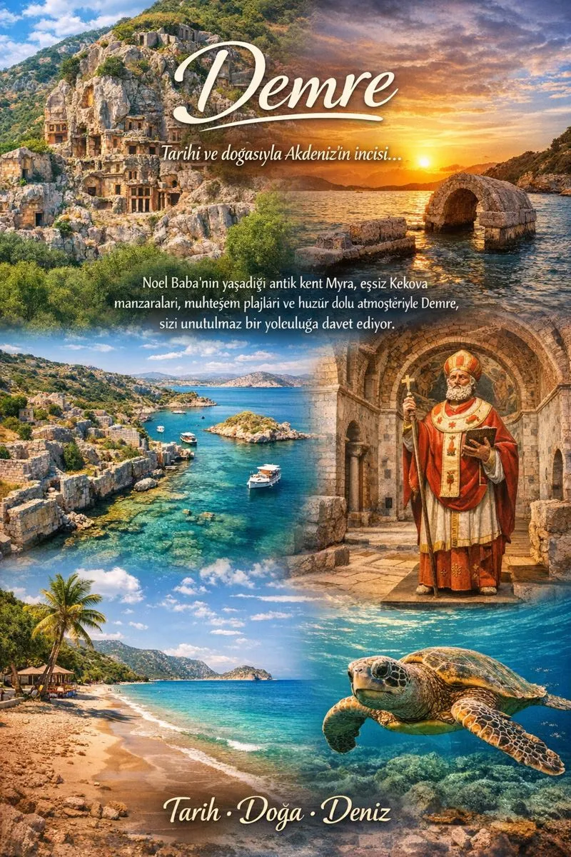 Likya Birliği'nde 3 oy hakkına sahip 6 şehirden biri olan Myra, M.S. 5. yy'da Likya Birliği'nin başkenti olmuş. Adını myra(mür) yağının üretildiği mersin bitkisinden aldığı düşünülüyor. Myra Antik Kenti özellikle Likya Dönemi kaya mezarları, Roma Dönemi tiyatrosu ile ünlü. Ev tipi mezarların en güzellerine Myra'da rastlanıyor. Nekrapol alanında yer alan çoğunluğu düz damlı bazıları üçgen çatılı kaya mezarları, o dönemin ahşap ev yapılarının taklitleri aslında.
